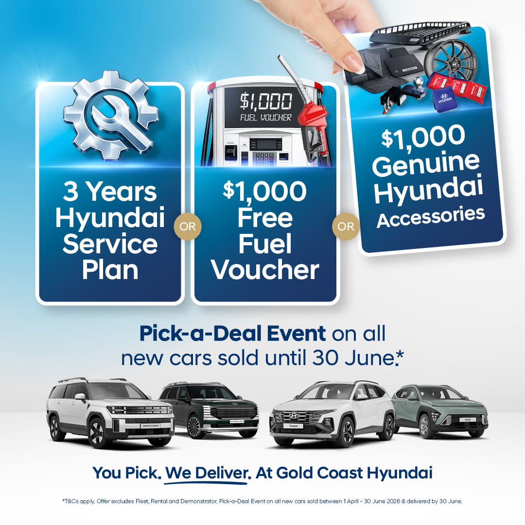 *Terms and conditions apply. All customers who purchase a new Hyundai vehicle between 1 April 2026 and 30 June 2026 and with a vehicle delivery on or prior to 30 June 2026 will be eligible one (1) opportunity per purchased vehicle to select one of the three offered deals. The deal will be issued to the customer on delivery of their vehicle on or prior to 30 June 2026, or if the customer chooses a Voucher, the Voucher will be delivered within one (1) week of vehicle delivery. Excludes government, fleet, demonstrator vehicles, and rental buyers. Deals offered include: 3 years Hyundai Service Plan, $1,000 Fuel Voucher, and $1,000 Voucher for Genuine Hyundai Accessories. Offer is subject to change, cancellation, and not available in conjunction with any other offer or discount.